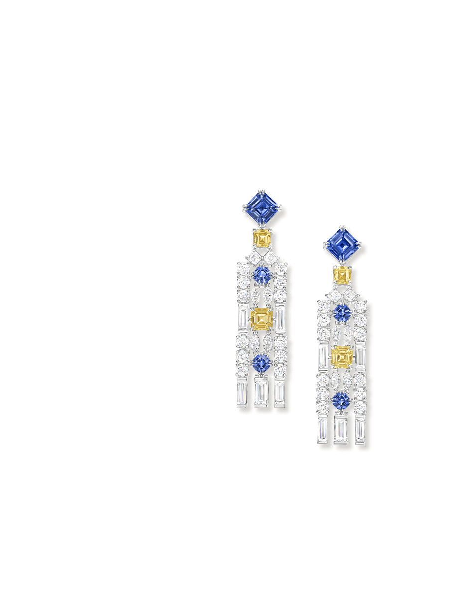 Méticuleusement conçues à partir d’émeraudes, de saphirs et de diamants dans un agencement géométrique, cette paire de boucles d'oreilles Brownstone évoque les façades distinctives des résidences historiques de New York, ajoutant une touche de splendeur aux oreilles.