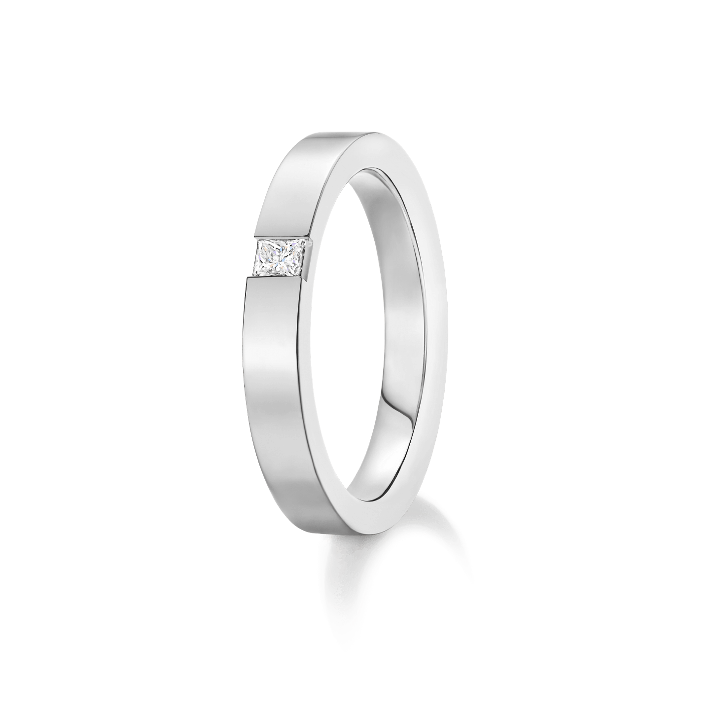1石のプリンセスカット・ダイヤモンドがプラチナ製バンドにセッティングされた、プリンセスカット・マリッジリング。そのシャープなラインはエンゲージメントリングを引き立て、クールな印象を演出します。