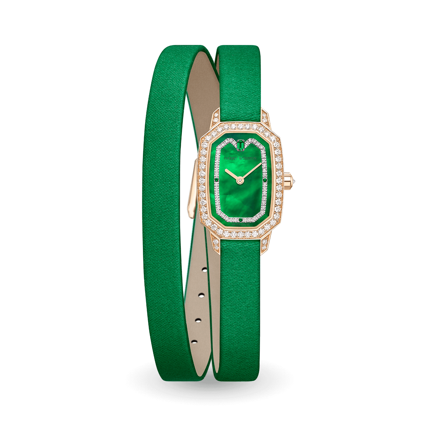 鮮やかなグリーンのトーンにダイヤモンドとマザー・オブ・パールが輝きを添える、「HW エメラルド」。タイムピースの実用性とジュエリーが持つ華やかな存在感の双方を兼ね備えた、エレガントなタイムピースです。