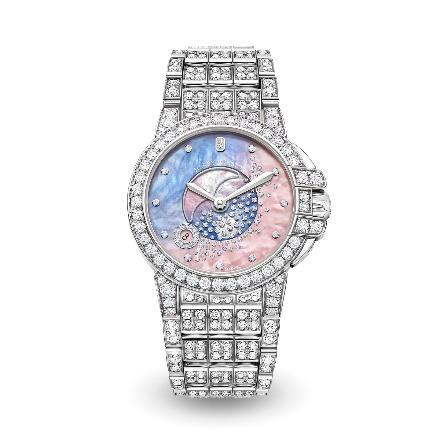 天体や海のエレメントを魅力的に再現し、宇宙の絶対的な美しさを表現した「HW オーシャン・ムーンフェイズ 36mm」。マザー・オブ・パールのダイヤルでは、ダイヤモンドのベールで覆われた幻想的なムーンフェイズが、空に浮遊しているかの様な情景を表現しています。