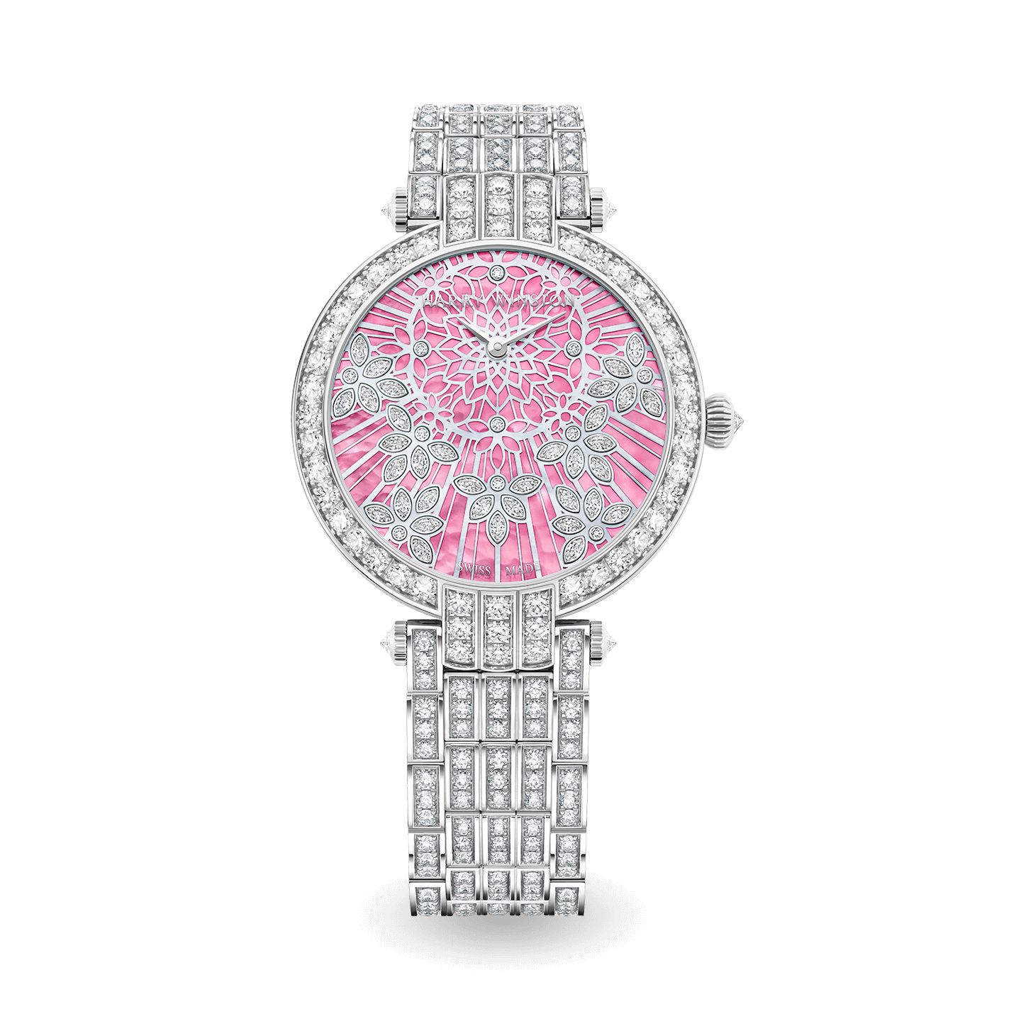 自然からインスピレーションを得た「HW プルミエール・プレシャス レース オートマティック 36mm」。マザー・オブ・パールの美しい光沢と、ハリー・ウィンストンが厳選した最高級のダイヤモンドが放つ強い輝きが、圧倒的な存在感を放ちます。