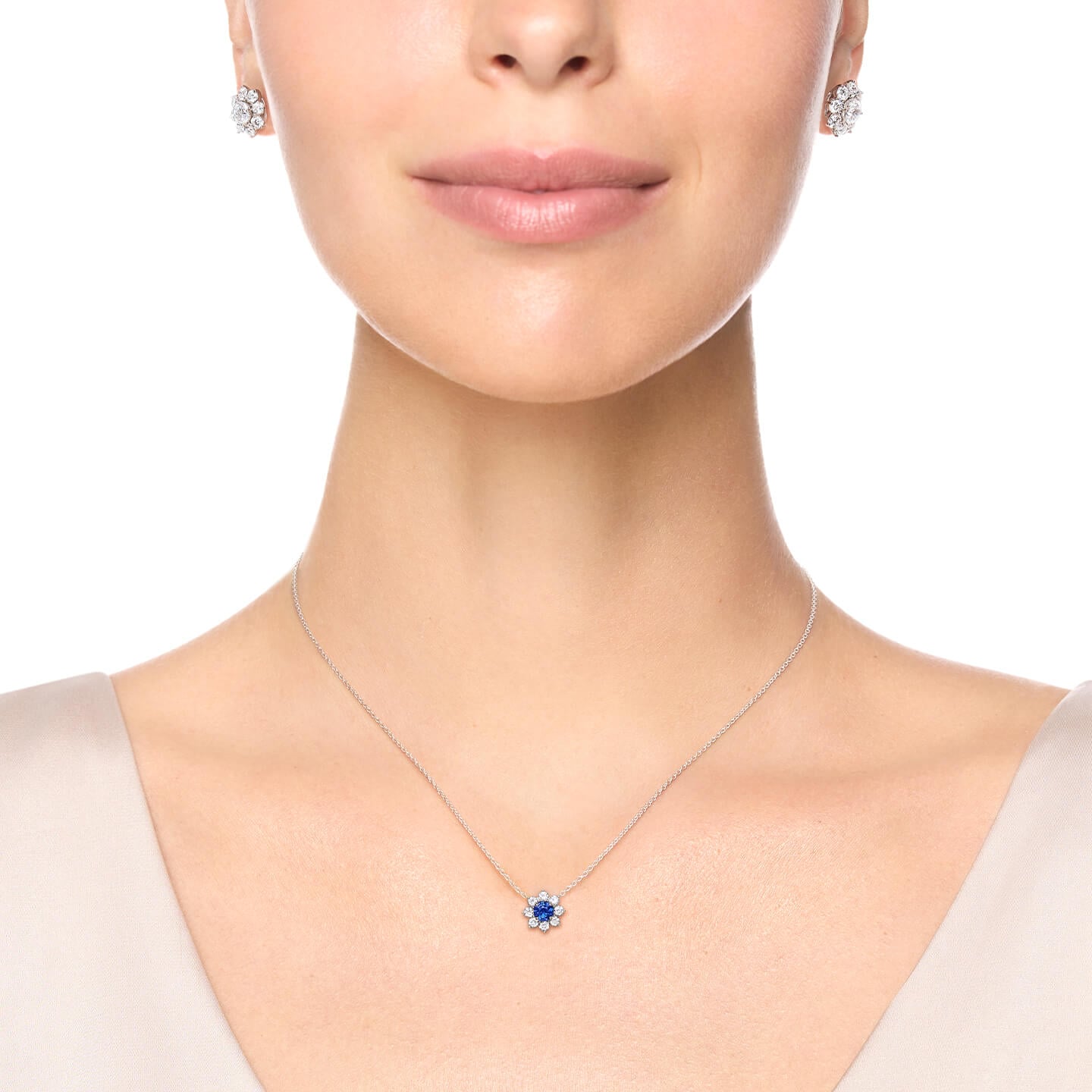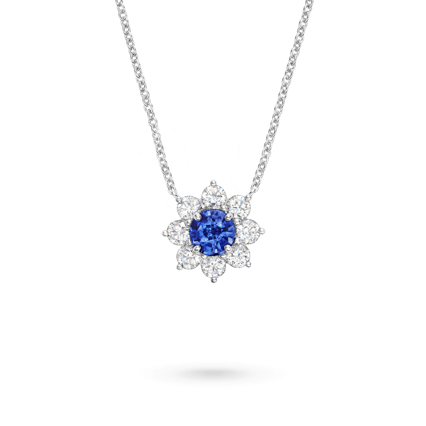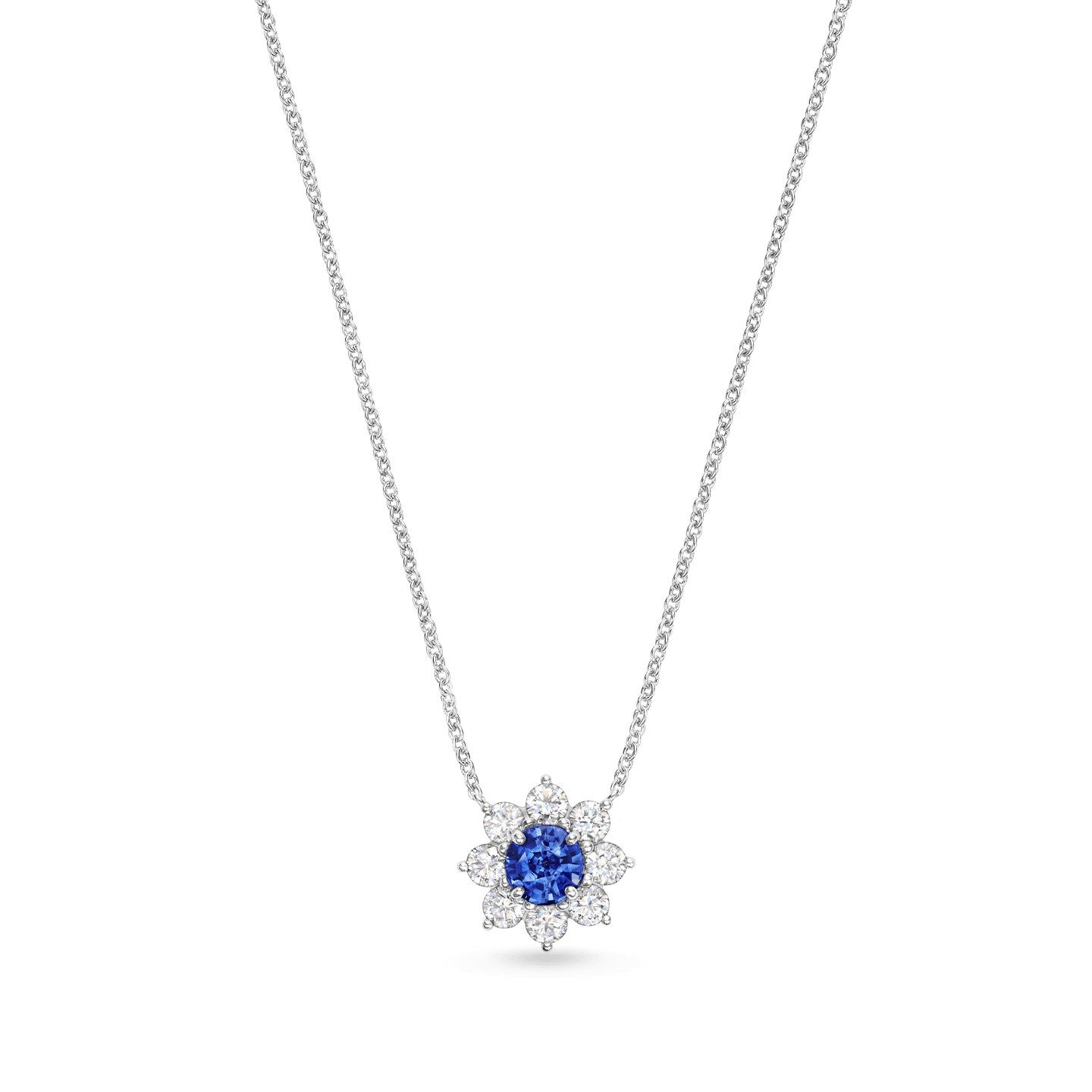 センター:1個のラウンド・サファイア(約0.42カラット)8個のラウンド・ダイヤモンド(計約0.44カラット)、プラチナ製。
