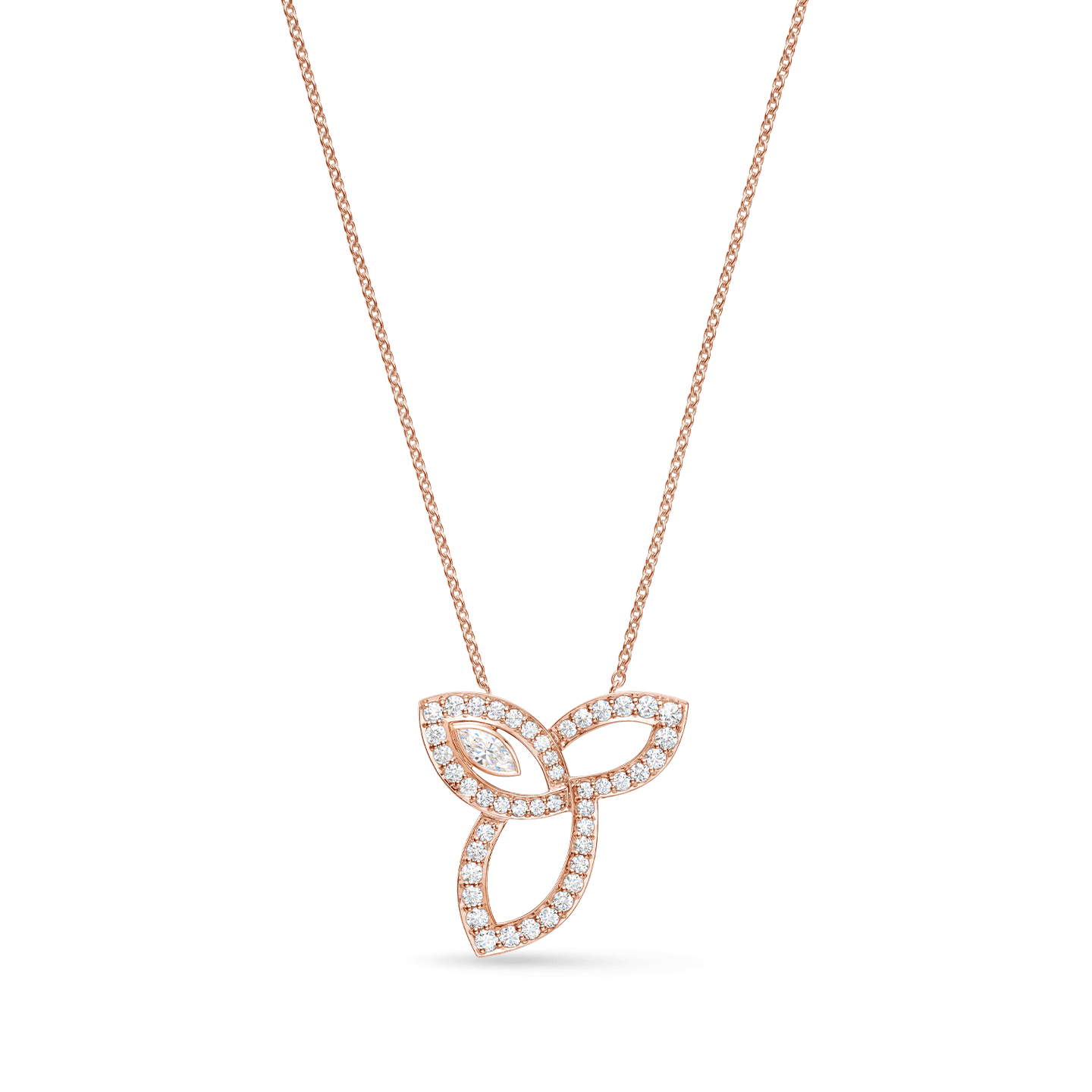 1颗榄尖形切工和45颗圆形明亮式切工,总重约0.68克拉的钻石,镶嵌于玫瑰18K金底座之上。
