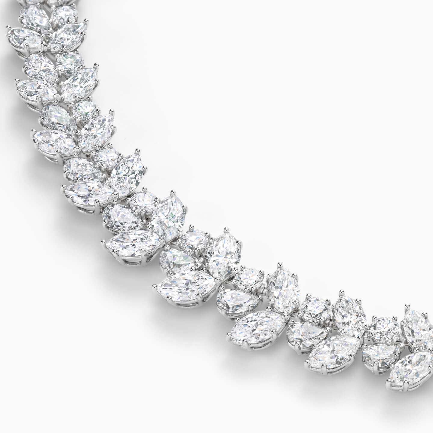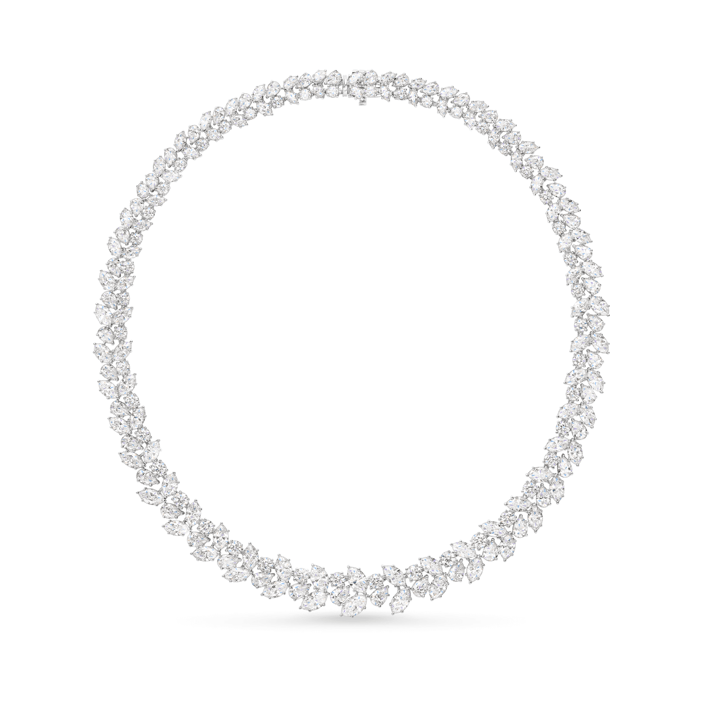 180颗榄尖形、水滴形和圆形明亮式切工,总重约48.80克拉的钻石,悉心镶嵌于铂金底座之上。
