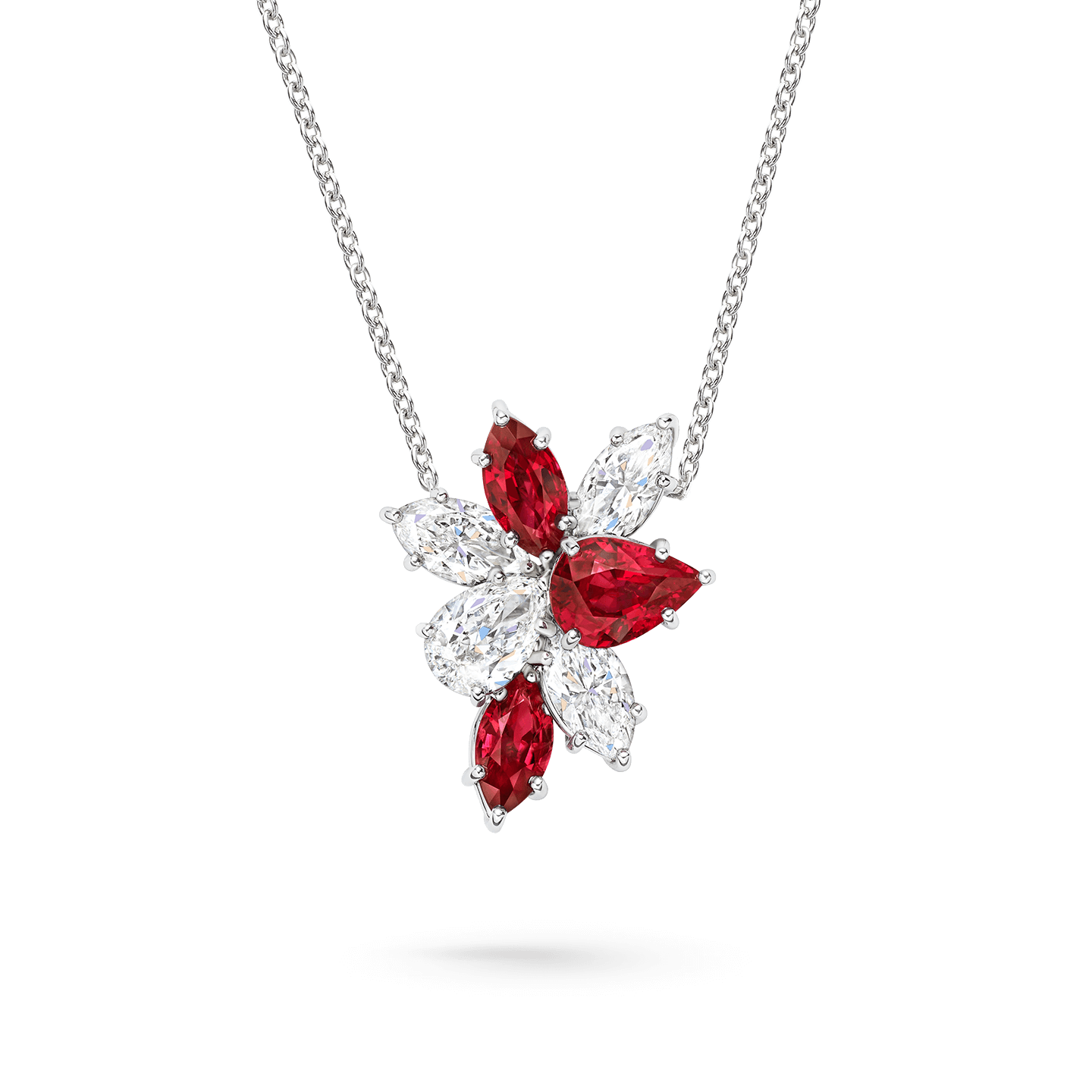 3颗榄尖形和水滴形切工,总重约2.50克拉的红宝石金和4颗榄尖形和水滴形切工,总重约2.21克拉的钻石,悉心镶嵌于铂金底座之上。