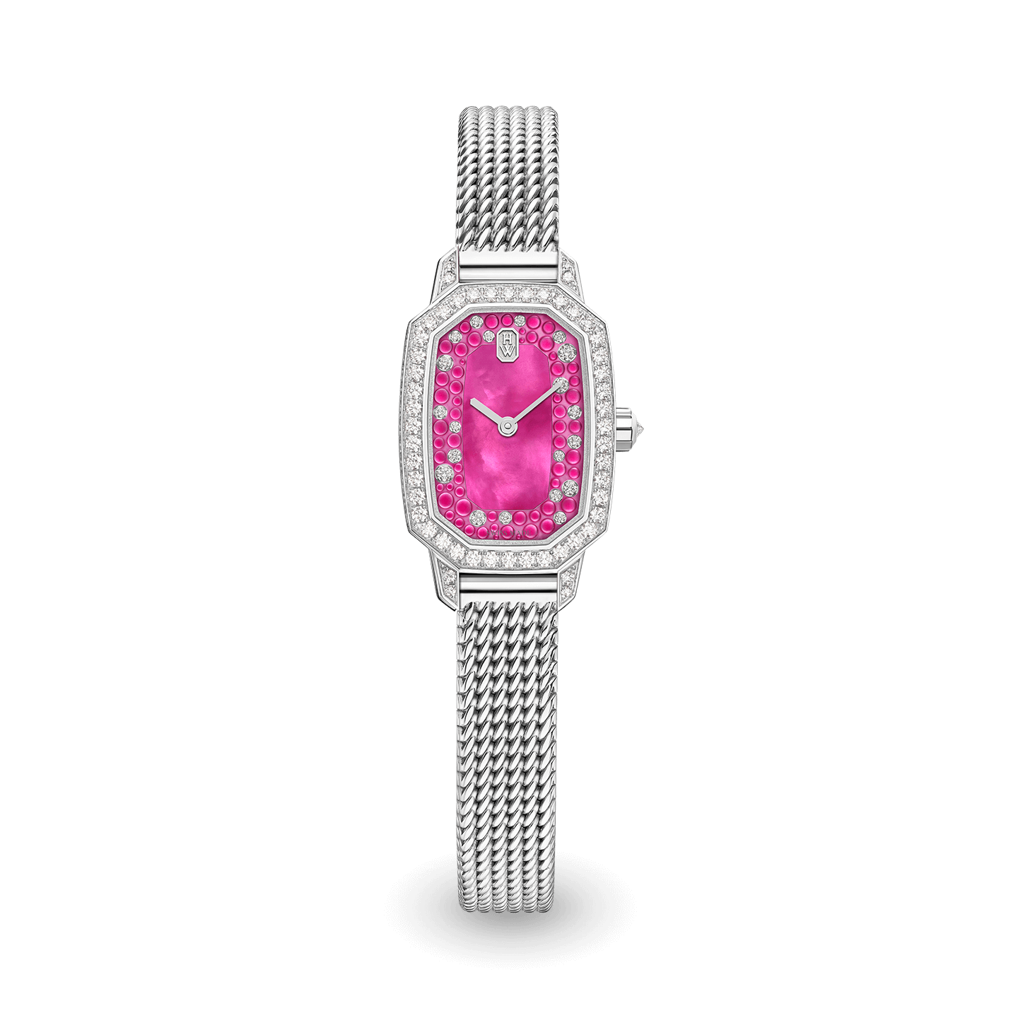 全新的海瑞溫斯頓經典印記Emerald腕錶,以極為明亮鮮豔的風貌登場。高彩度的珍珠母貝與鑽石相得益彰,錶盤上更鑲嵌了同色系的蛋面切工珍珠母貝作為裝飾,建構出充滿活力的全新印記Emerald腕錶。