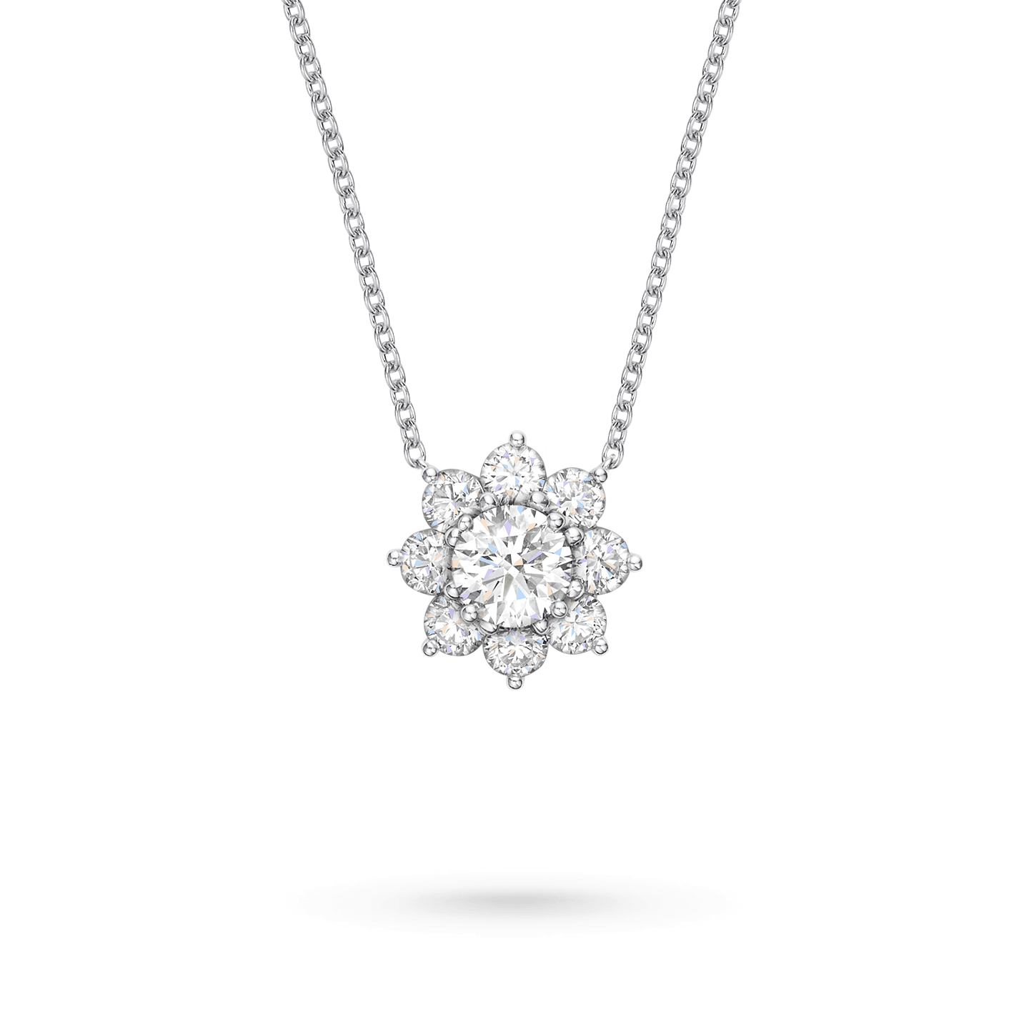 9顆圓形明亮式切工鑽石,總重約為1.55克拉,中間主石重量約為0.70克拉,悉心鑲嵌於鉑金底座。
